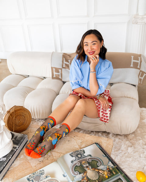 Trasportati in Italia con il nostro calzino nero trasparente La Dolce Vita, che presenta elementi classici di una tavola italiana, con pasta fresca e pesce, motivi floreali rustici e calici da vino vintage. L’estate italiana perfetta è a portata di mano con questo delizioso calzino. Abbinalo a sandali rossi e un Aperol Spritz.