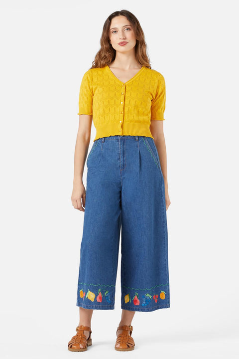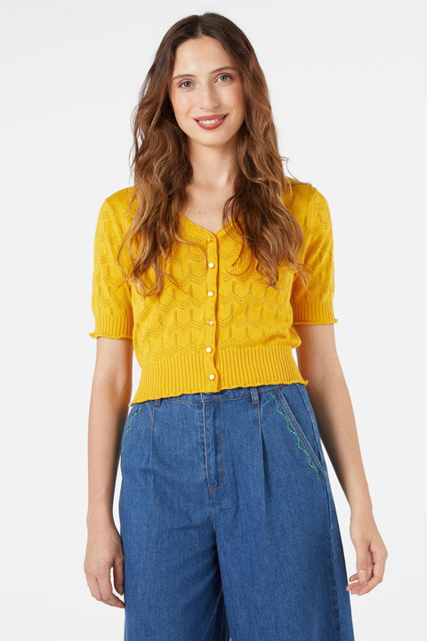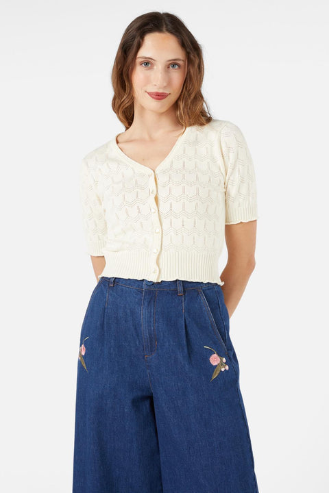 Cardigan a maniche corte, lavorato a maglia, con scollo a V. Realizzato in cotone leggero, perfetto per l’estate