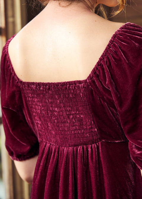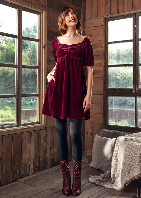 La dolcezza traspare dalla silhouette retrò-chic di questo abito babydoll del marchio ModCloth, mentre la struttura in velluto rosso prugna aggiunge un fascino inconfondibile. Sicuramente un capo amatissimo per le feste, questo abito da festa dallo stile festoso e disinvolto vanta uno scollo a cuore, maniche a sbuffo con dettagli elasticizzati e arricciati su spalle e polsini, drappeggio sul busto, un pannello arricciato sul retro per una vestibilità comoda e un’adorabile vita impero con dettagli arricciati che scende in una gonna drappeggiata sopra il ginocchio.