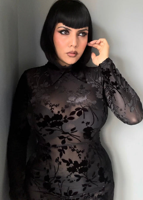 Questo abito lungo in velluto trasparente con stampa floreale e effetto burnout, che avvolge le curve, è incredibilmente elastico e aderente. Presenta una gonna a sirena svasata e allacciatura sul retro per stringere la vita. L’abito è trasparente ma può essere facilmente indossato con una sottoveste nera, se lo si desidera.