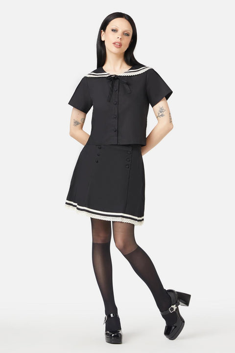 Un top in stile gotico da marinaio caratterizzato da una forma squadrata, un ampio colletto alla marinara con ricamo di una falena sul retro e un dettaglio a fiocco sulla scollatura frontale.