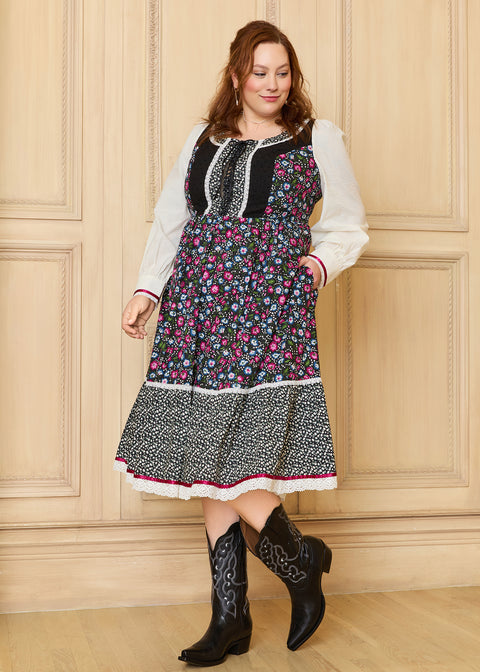 Fascino da prateria con l’abito midi Madilyn di GUNNE SAX per ModCloth. Il corpetto ispirato al corsetto con vita stretta offre un look che valorizza la figura con un tocco di fascino vintage. L’abito a maniche lunghe con doppia stampa presenta polsini decorati, orlo con dettagli in pizzo e tasche! Questo abito sopra gli stivali è perfetto per ogni stagione.