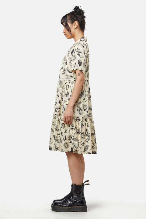 Questo esclusivo abito baby doll combina un tocco grafico con un comfort senza sforzo. Caratterizzato dall’esclusiva stampa ‘Body Fossils’, ha un taglio rilassato e oversize con maniche a T-shirt e un dettaglio con bottoni sul davanti, creando un look casual ma grintoso. Realizzato in morbida viscosa, questo abito è perfetto per uno styling facile e un comfort.