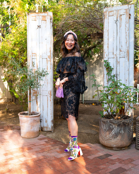 Ispirati a La Bella e la Bestia, i nostri calzini trasparenti floreali Stain Glass presentano motivi floreali viola, gialli e blu, insieme a pezzi astratti rosa che creano l’illusione di una vetrata. Rifiniti con tallone, punta e bordo viola per un tocco perfetto di eleganza e femminilità .