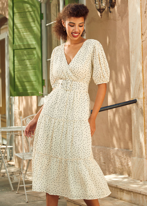 Elegante, nostalgico e romanticamente disinvolto, The Lillian Pearl è un gioiello dell’omonimo marchio ModCloth, ispirato al delicato glamour degli anni ’30. Caratterizzato da uno scollo a V incrociato, ampie maniche a palloncino e una gonna midi a balze che fluttua ad ogni movimento, questo abito dà vita ai sogni d’epoca. Che tu stia sorseggiando il tè in veranda o volteggiando sotto le luci decorative, il suo morbido drappeggio e la silhouette senza tempo lo rendono un capo da custodire ora e per sempre.