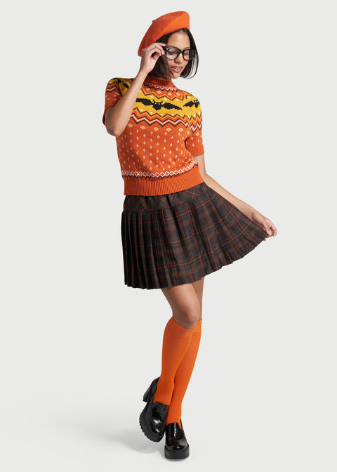 Originale e “pipistrello” fino al midollo, questo maglione arancione a maniche corte del nostro marchio ModCloth renderà qualsiasi outfit spettrale grazie al suo esclusivo motivo Fair Isle sul carré, caratterizzato da motivi di pipistrelli neri svolazzanti incorniciati da incroci, righe, punti e zig-zag, insieme a pois sparsi ovunque. Realizzato in morbidissima maglia di cotone, questo maglione pullover ha un classico scollo rotondo e una vestibilità comoda, ideale per essere indossato a strati durante la stagione fredda, tutto l’anno.