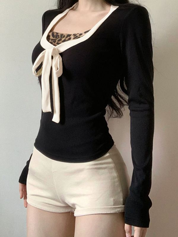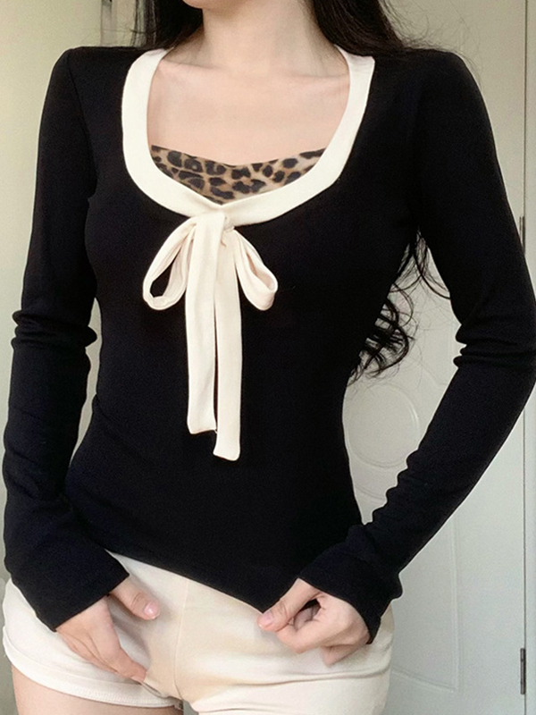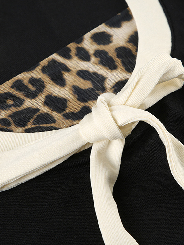 Camiseta de manga larga con lazo en contraste y estampado de leopardo