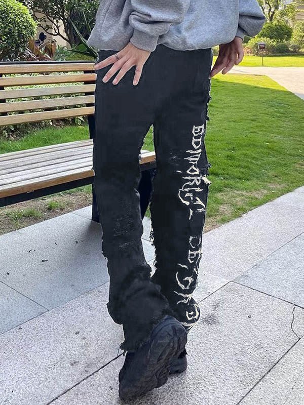 Descripción: Estos jeans desgastados se cortan en un calce de pierna recta, presenta agujeros rasgados deshilachados en la pierna y detalle de letras góticas bordadas en la parte posterior, con bolsillos funcionales, cierre de botón con cremallera y diseño de dobladillo sin rematar.