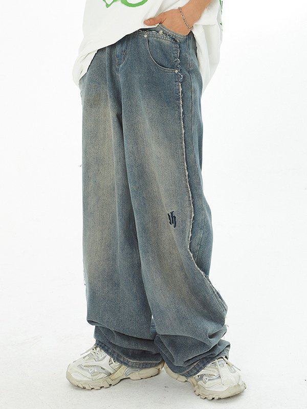 Descripción: Estos jeans sueltos de mezclilla con lavado descolorido para hombre con forma de Con silueta de pierna skater, tienen pierna de patchwork con diseño de ribetes sin rematar, un logo bordado y detalles funcionales de bolsillos de jeans.