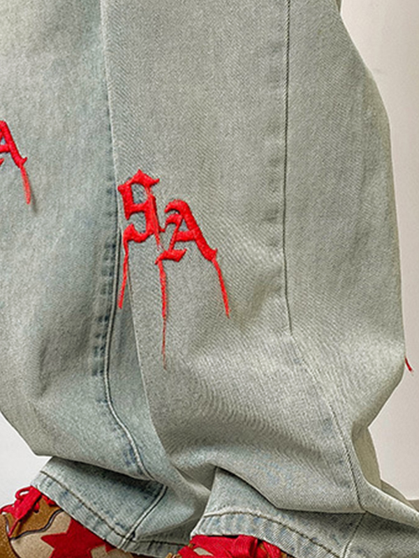 Descripción: Letra destacada bordada en la parte delantera y trasera, estos jeans tienen forma recta delgada Corte de pernera, bragueta con botón de cremallera y diseño de bolsillos funcionales.